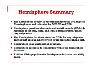 Hemisphere includes not just AT&T call records. It includes records from “CDRs for any telephone carrier that uses an AT&T switch to process a telephone call.” It gets 4 billion call records a day, including international ones and cell ones. As Scott Shane explained,