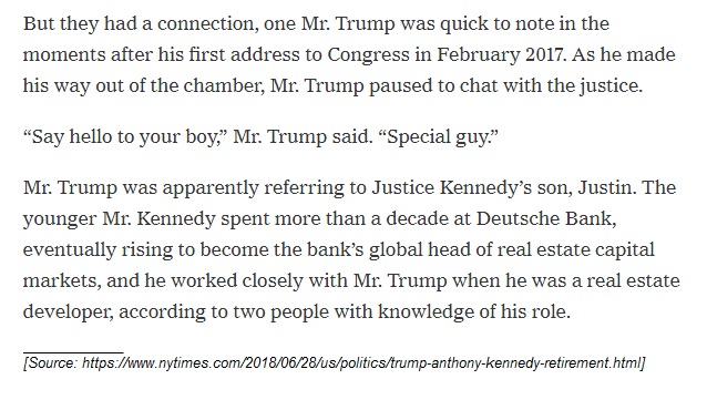 Could Anthony Kennedy have negotiated an opportunity to select a range of candidates or one candidate, based on the relationship his son had? We don’t yet have documented evidence like emails and memos to rule this out conclusively.