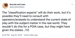 That’s all part of the process of figuring out whether Trump committed a crime. Before DOJ ever charged Trump for any of this, they would also have to work with the agencies to find documents that the agencies would be willing to expose to the prosecution process, which would involve sharing with Trump and his cleared defense attorneys. If Trump went to trial on Espionage Act charges, DOJ would have to declassify or “substitute” classified information (I wrote about that process here; here’s another good overview). And the agencies would not want to do this with the most sensitive documents.