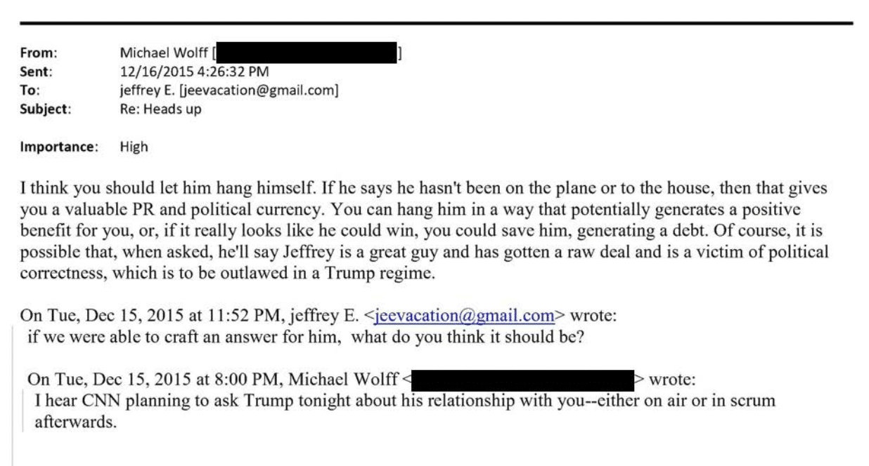 The most intriguing was another email exchanged with Wolff, just six months before Epstein was arrested and then suicided, in which Epstein claimed Trump was lying when he “said he asked me to resign, never a member ever.”