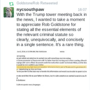 Remember: to be charged with conspiracy, the conspiracy doesn’t have to be successful. So even ignoring the “documents and information” the Russians started releasing a week later, that “it turned out to be a meeting about another subject,” as Rudy excuses, doesn’t help Jr. He took a meeting to obtain dirt.